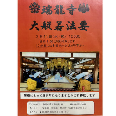 静岡市葵区井宮町の瑞龍寺さまにて、《大般若法要》が行われます。